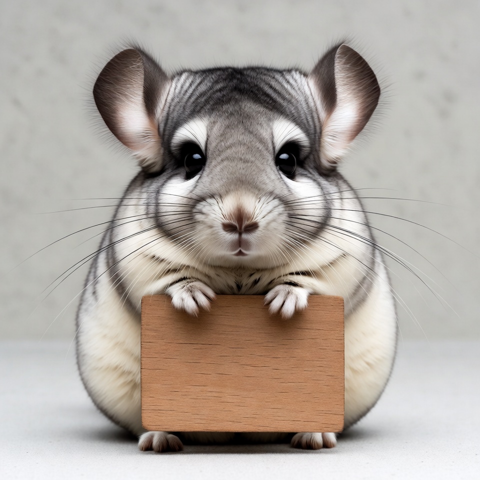 A fluffy gray chinchilla with large dark eyes holds a rectangular wooden sign with its front paws. It sits on a plain light gray background, looking directly at the camera. The chinchilla has white fur on its belly and paws.