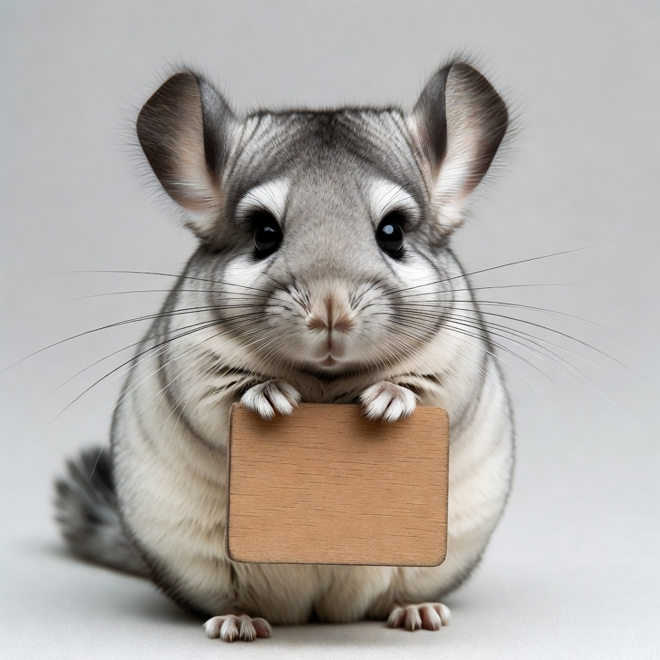 animal, big eyes, blank sign, cute chinchilla, fluffy chinchilla, furry animal, gray chinchilla, holding sign, isolated background, paws, pet, rodent, sign holder, whiskers, wooden sign, chinchilla