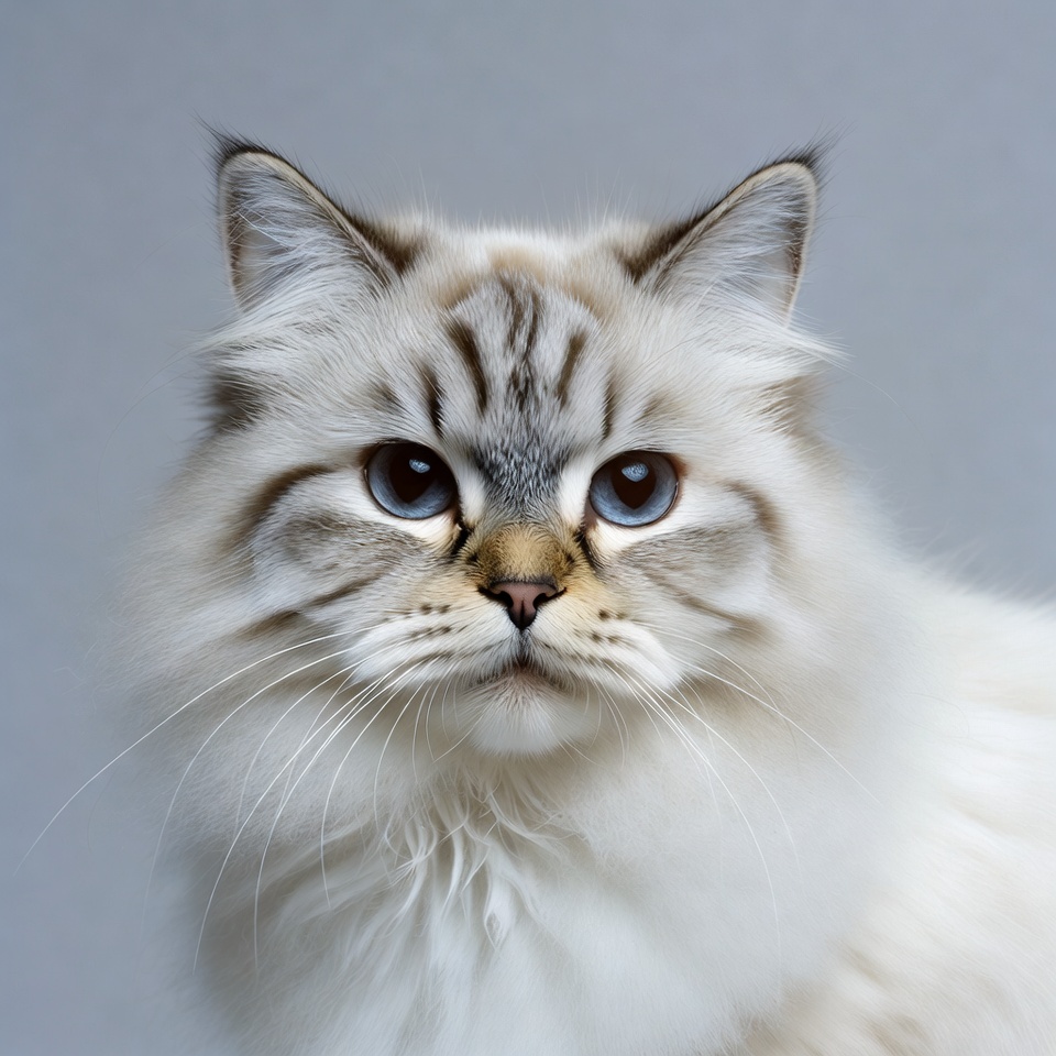 A fluffy British Shorthair cat with light gray and white fur stares directly at the camera with striking blue eyes. Its long whiskers and pink nose are prominent on a plain gray background. The cat's expressive face features subtle tabby markings.