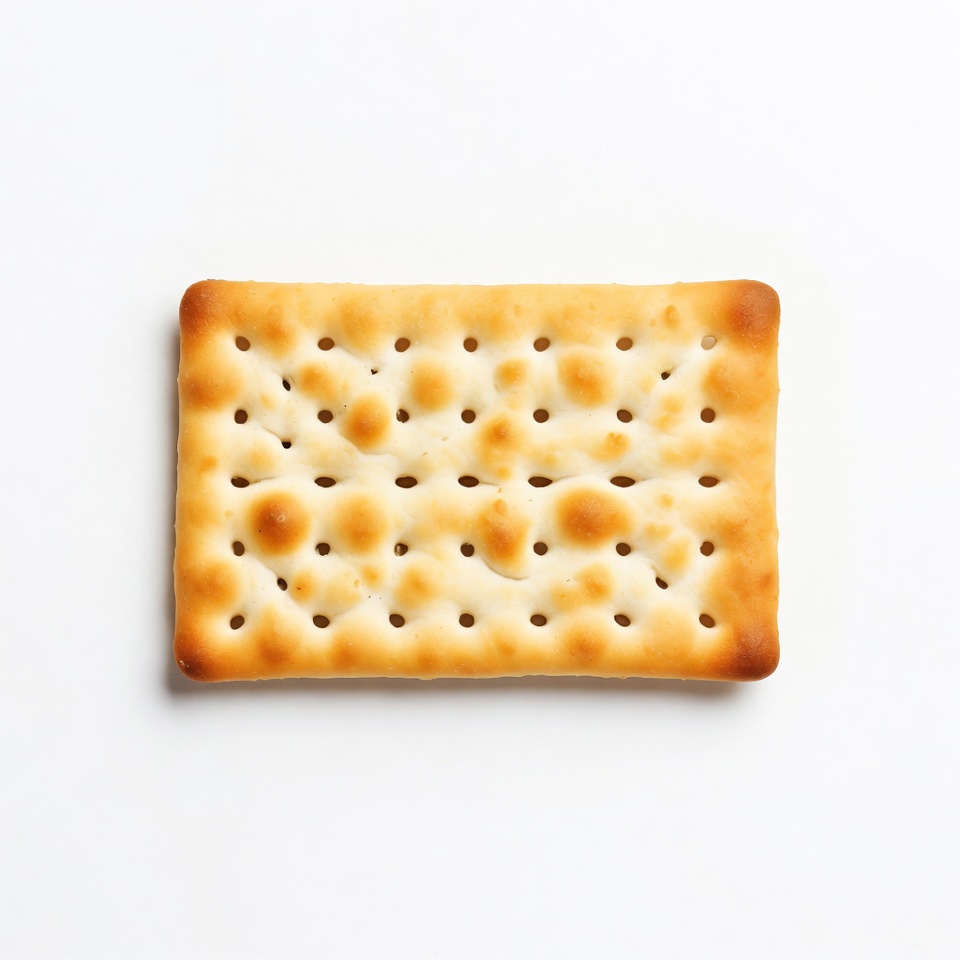 baked good, closeup, food, golden brown, holes, isolated, product photography, rectangular cracker, saltine cracker, single cracker, snack, textured surface, top view, white background, cracker