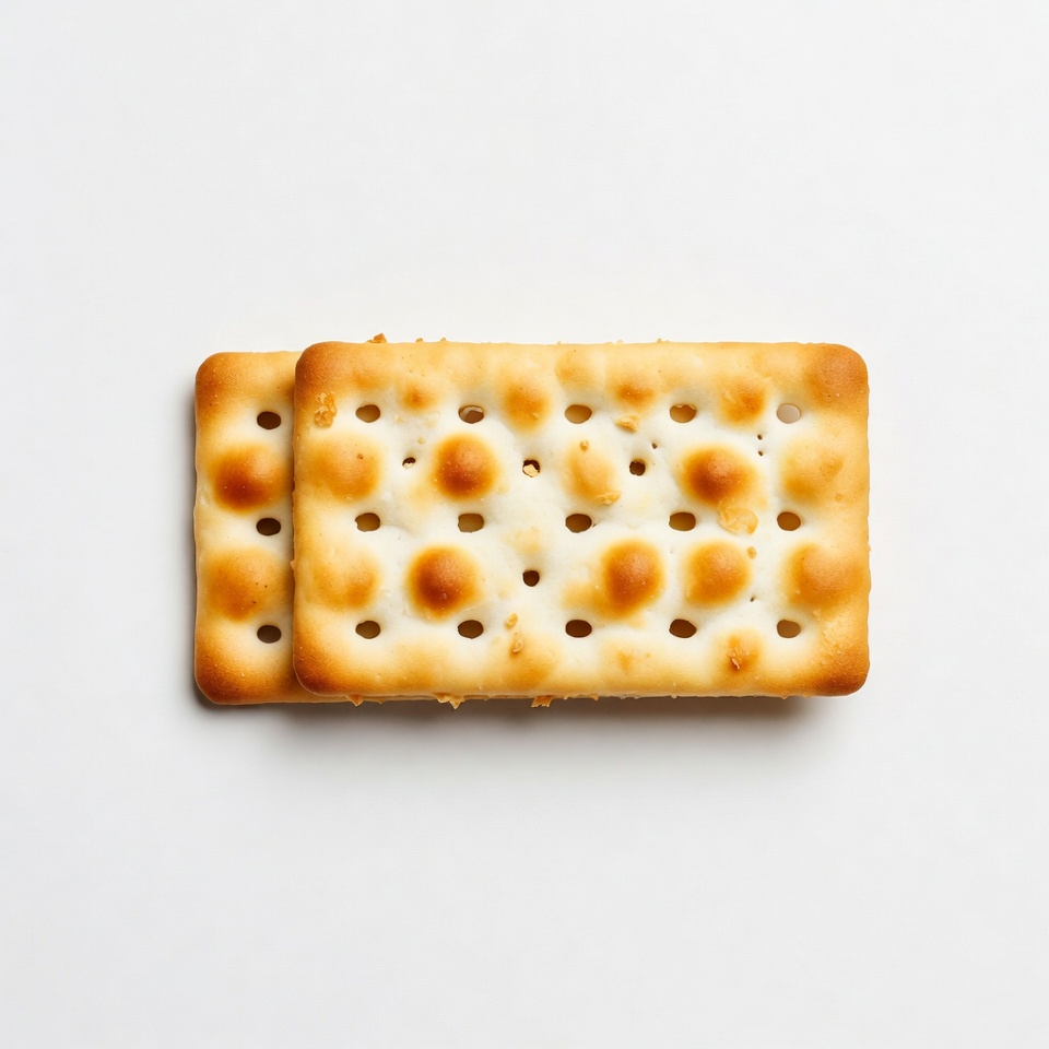 Two golden brown crackers with dotted holes are stacked on top of each other. They rest on a plain white surface, isolated for a clean product view. The crackers have a crisp, textured appearance.