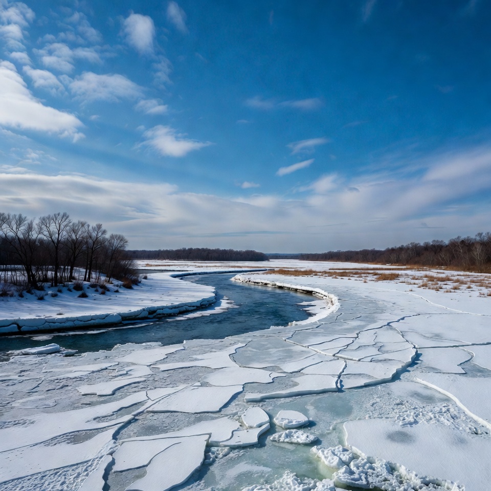 A frozen river curves through a snowy marshland under a partly cloudy blue sky. Bare trees line the distant banks, and patches of ice float on the water's surface. Snow covers the ground on both sides of the river.
