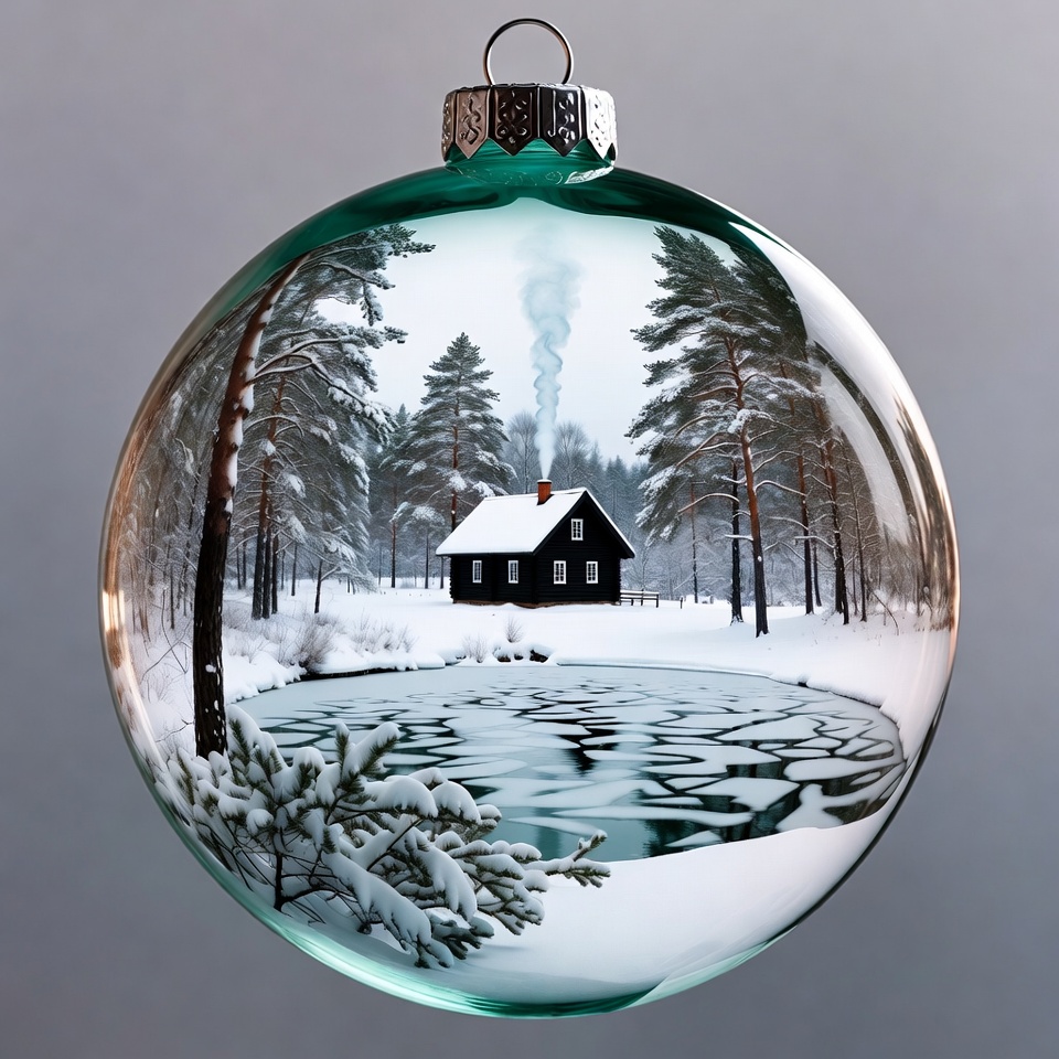 A clear glass Christmas ornament contains a winter scene with a small black house covered in snow. Smoke rises from the chimney as tall pine trees surround the house and a frozen pond nearby. The bauble hangs against a plain gray background.