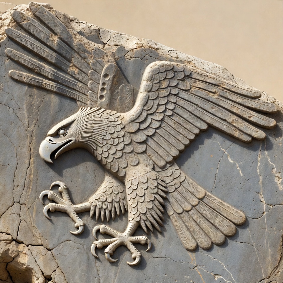 Persian style, ancient eagle, archaeological, bas-relief, beak, beige rock, bird carving, carved eagle, detailed carving, emblem, feathers, fierce eagle, historical art, isolated background, relief sculpture, sculpture, stone carving, stone wall, talons, wings outstretched, eagle