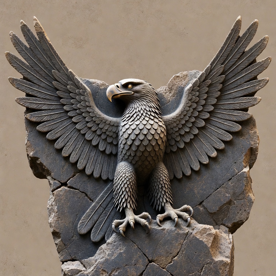 A detailed stone sculpture of an eagle with wings spread wide stands on a rocky base. The eagle features intricate feather carvings, a sharp beak, and fierce eyes. It is positioned against a neutral background, emphasizing its majestic form.