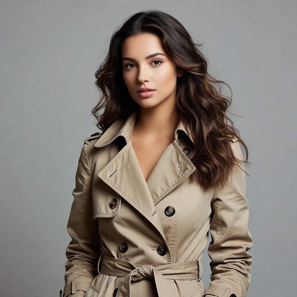 A young woman with long wavy brown hair stands confidently against a gray background. She wears a belted beige trench coat with double-breasted buttons and a deep neckline. Her expression is neutral with a slight smile.