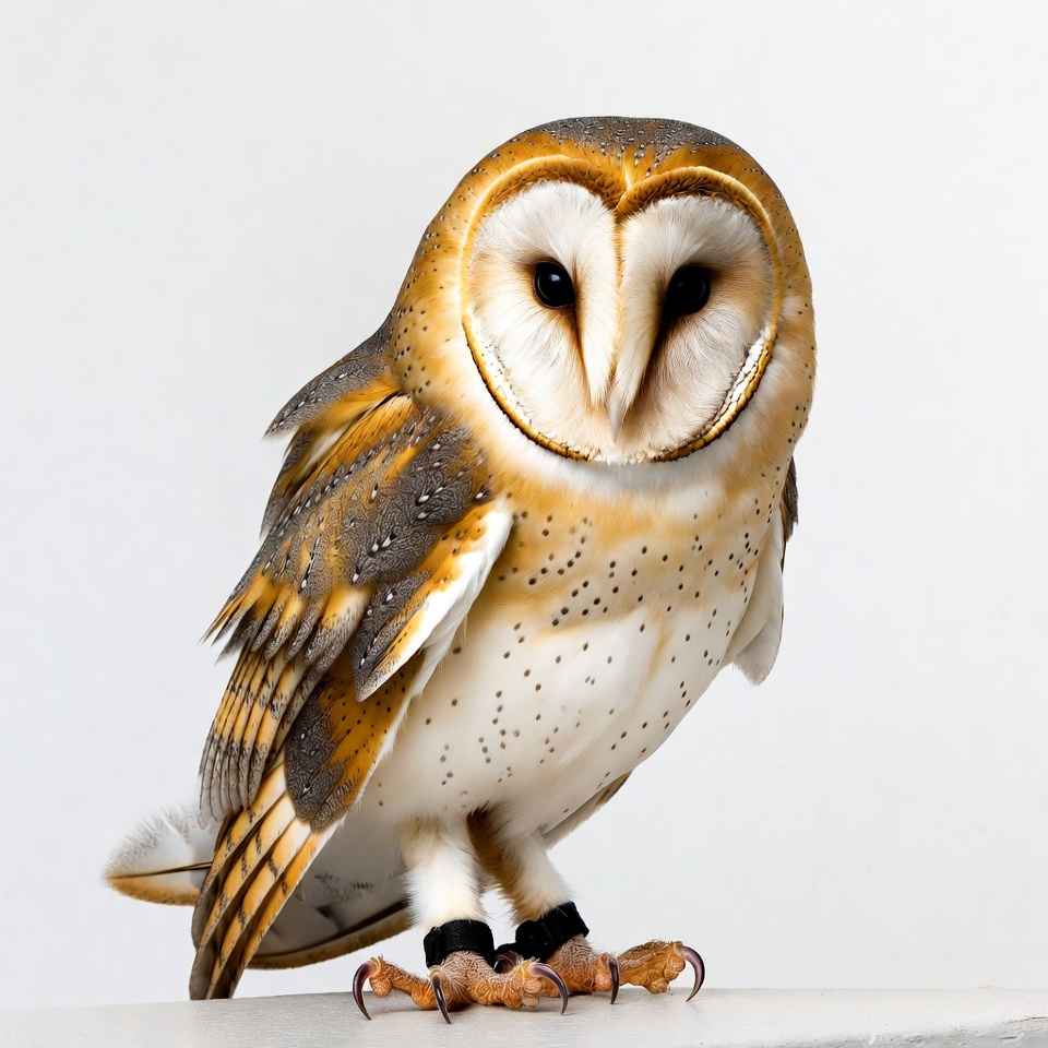 A majestic barn owl with striking orange and white facial feathers stares directly at the viewer. Its large black eyes and heart-shaped face are framed by brown speckled wings and feathers. The owl stands on a white surface with talons extended, isolated against a plain white background.