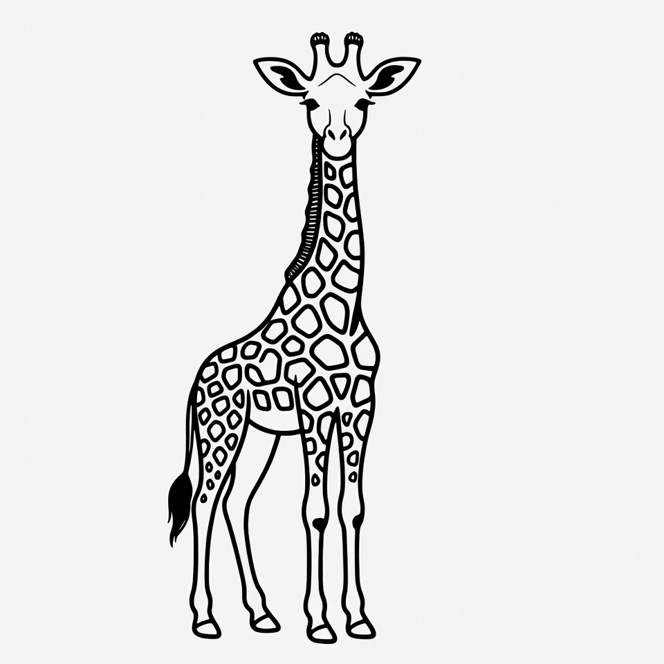 A black and white line drawing of a giraffe stands on a plain white background. The giraffe features detailed spots, long neck, ossicones, large ears, and a tail. It is depicted in a side profile view with expressive eyes.