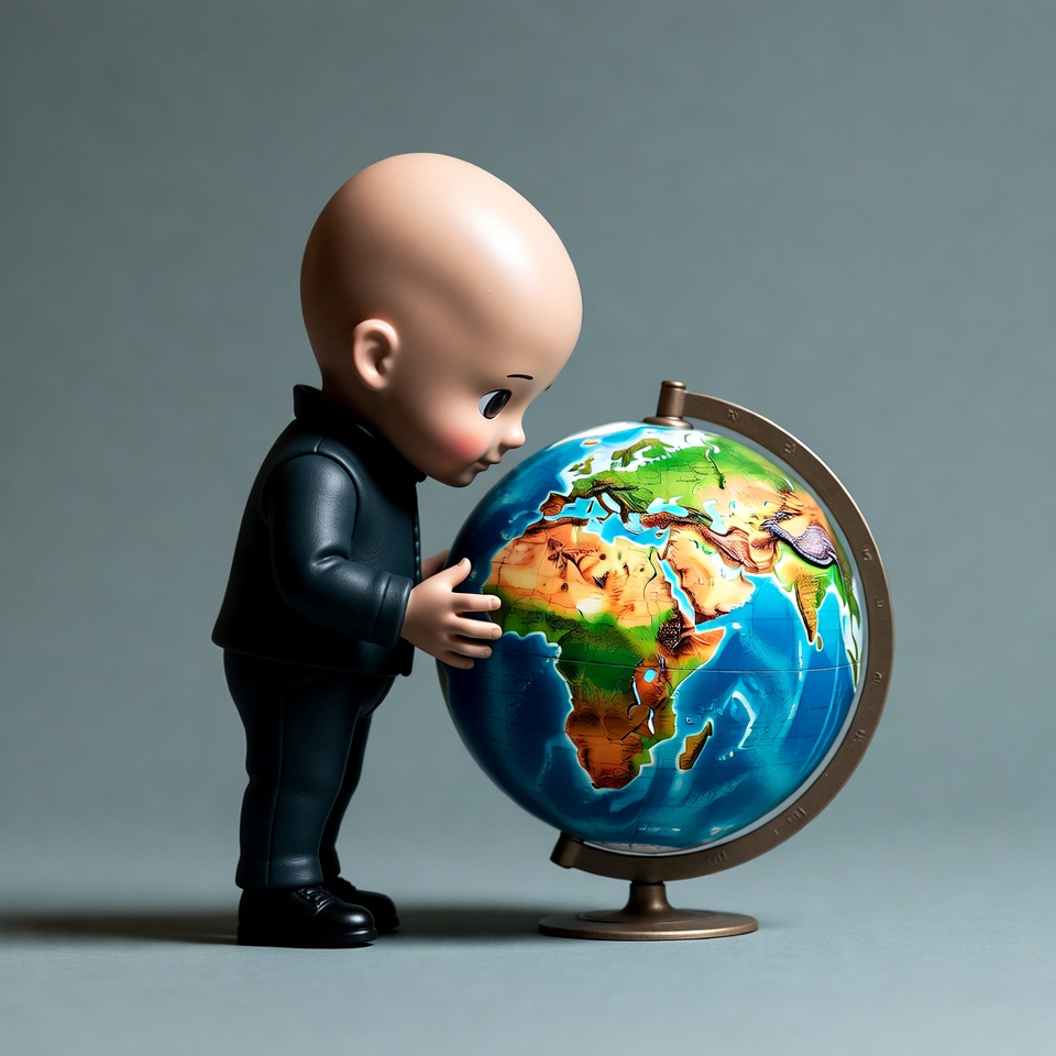 A bald baby-like figurine dressed in a black business suit stands on a gray background, hugging a detailed globe. The figurine has large expressive eyes and shiny bald head. The colorful globe shows continents like Africa, Europe, and Asia on its stand.