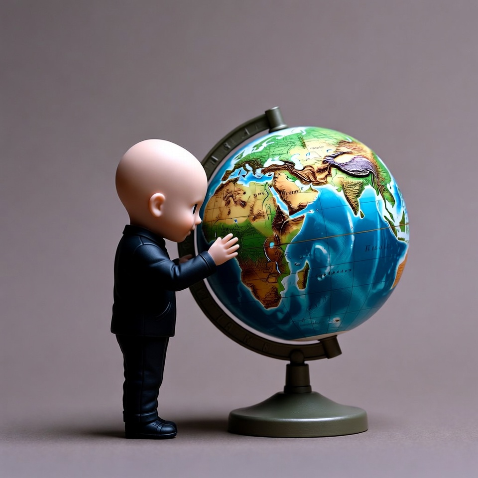 A bald baby boy dressed in a black suit stands next to a colorful globe on a gray background. He reaches out with one hand to gently touch the globe, which features detailed continents like Africa and Asia. The figurine-like boy appears curious as he interacts with the world map.