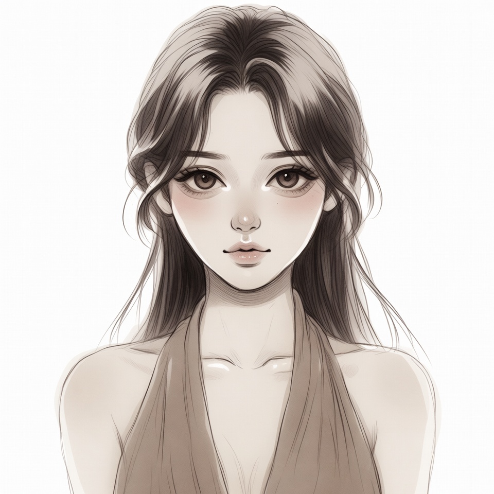 A detailed digital illustration of a young Asian woman with long dark hair styled loosely over her shoulders. She has expressive eyes with subtle makeup and wears a soft beige tube top. The portrait is set against a plain white background, highlighting her delicate facial features.