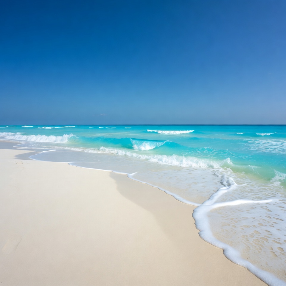 Crystal-clear turquoise ocean waves crash onto pristine white sandy beach under a clear blue sky. Gentle foam edges the shoreline as the water meets the sand. The scene captures the vibrant colors of a tropical paradise.