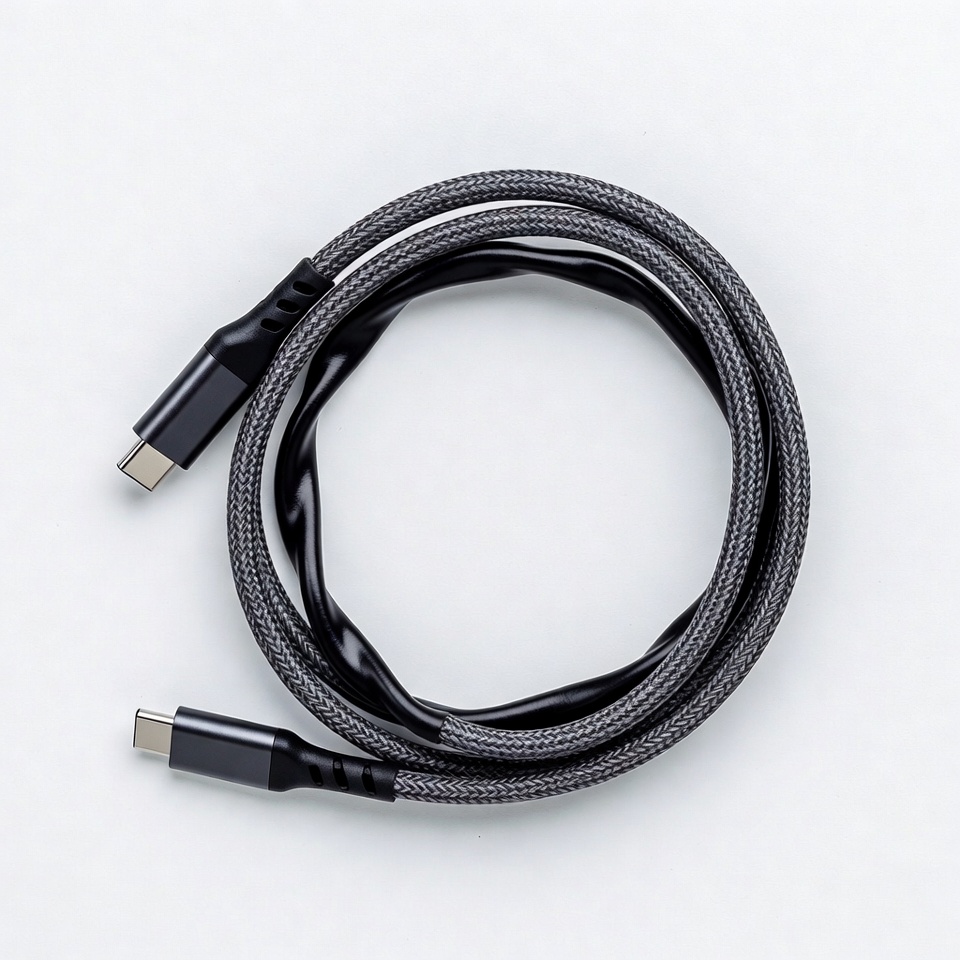 USB C, black cable, braided cable, cable connector, charging cable, coiled cable, data cable, fast charging, isolated background, laptop cable, nylon cable, phone charger, tech accessory, white background, USB-C cable