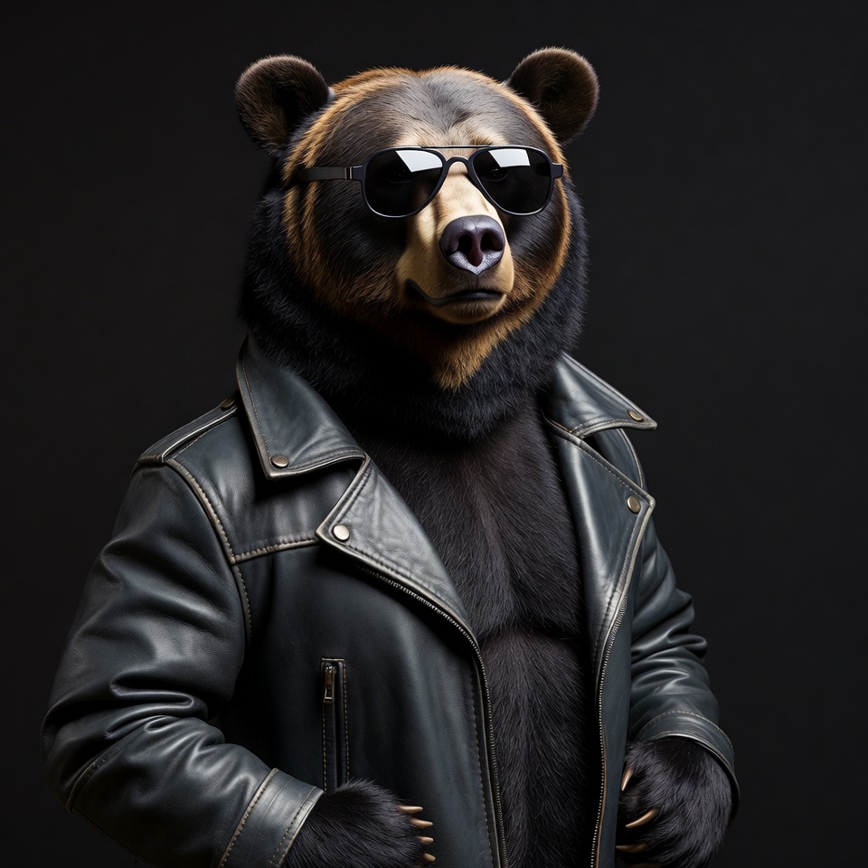 A realistic anthropomorphic bear with brown and black fur stands confidently against a black background. It wears dark aviator sunglasses and a black leather jacket with silver details. The bear has a serious expression with paws crossed in front.