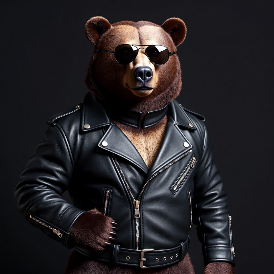 A realistic 3D rendered brown bear stands confidently against a black background. It wears dark aviator sunglasses, an open black leather biker jacket with silver zippers, and a wide belt. The bear has a serious expression with paws visible at its sides.