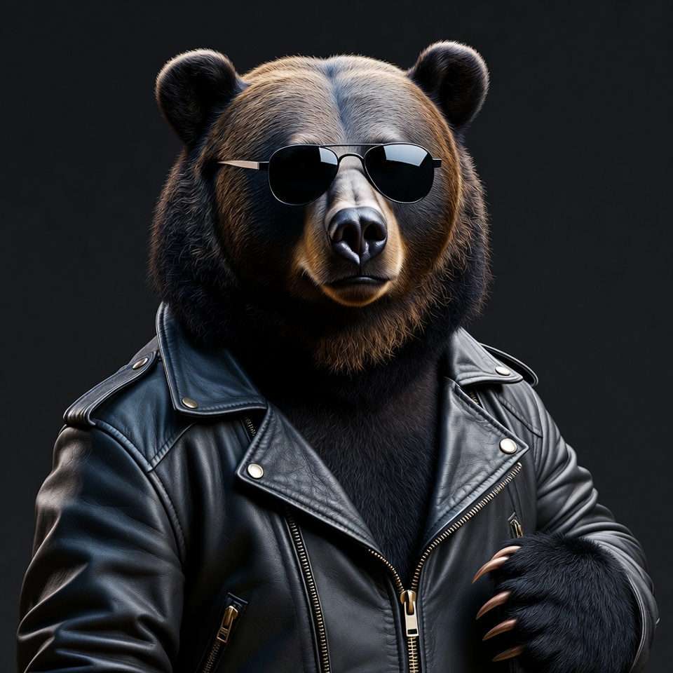 A realistic 3D rendered brown bear stands confidently against a black background. It wears dark aviator sunglasses and a black leather jacket with silver zippers. The bear has a slight smile and paws crossed casually.