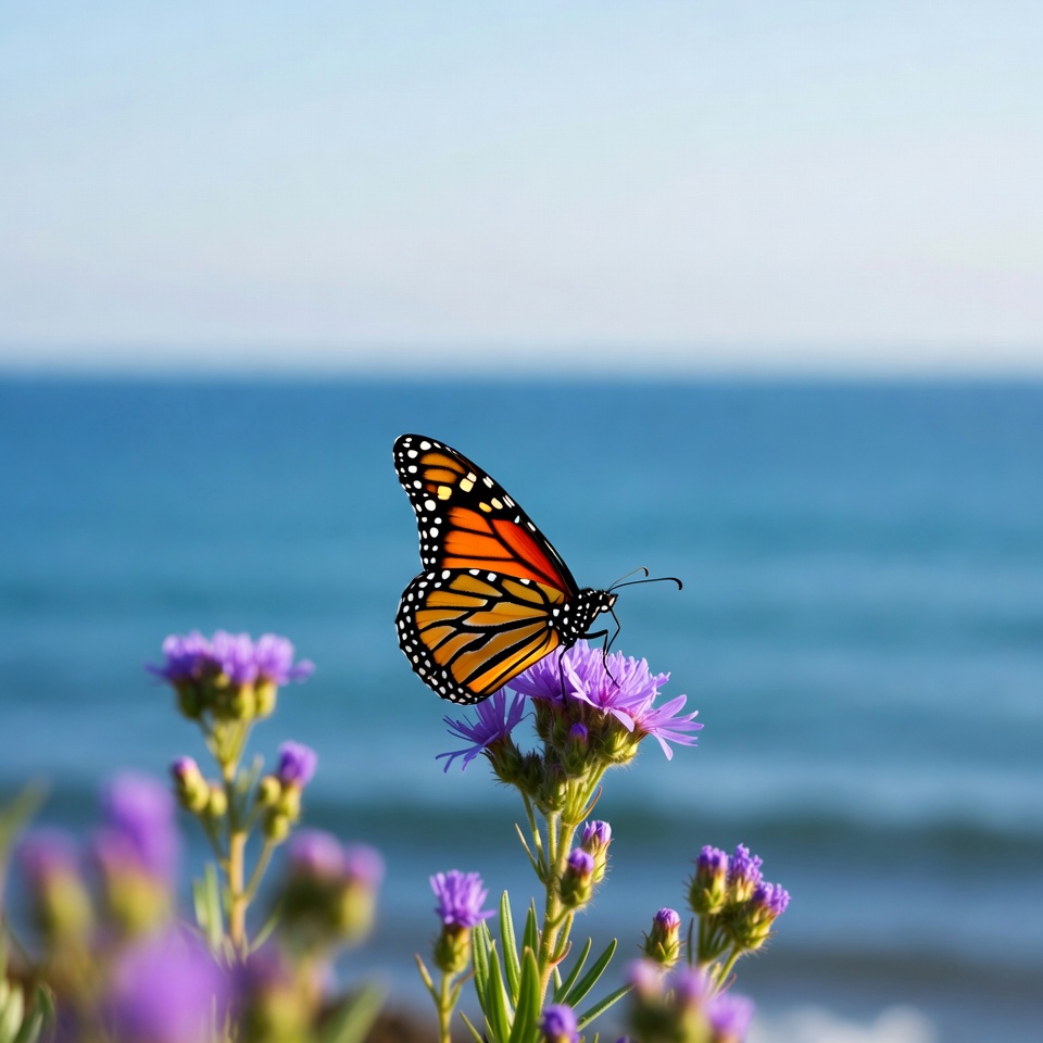 black wings, blue ocean, blue sky, butterfly, flowers, insect, isolated background, nature, ocean background, orange butterfly, purple flowers, white spots, wildlife, monarch butterfly