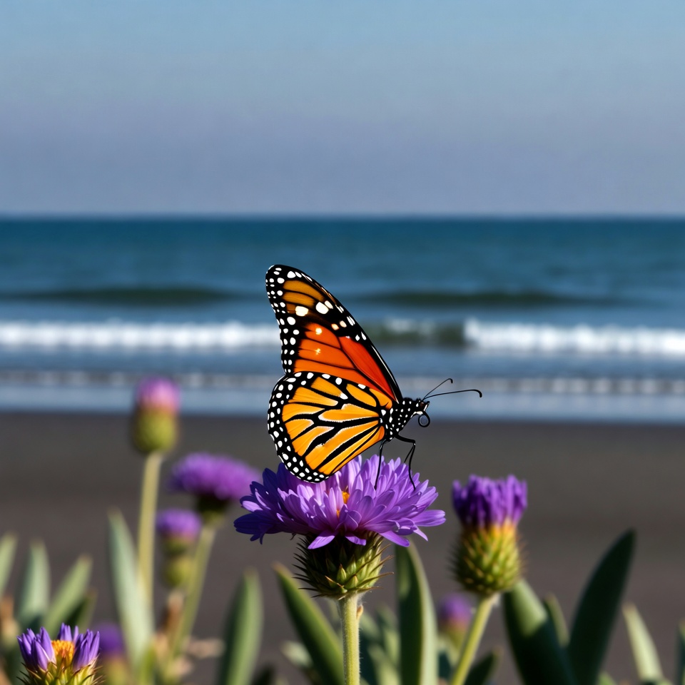 beach, black butterfly, blue sky, butterfly, flowers, green stems, insect, isolated background, nature, ocean waves, orange butterfly, purple flower, sea, thistle flower, wildlife, wings, monarch butterfly