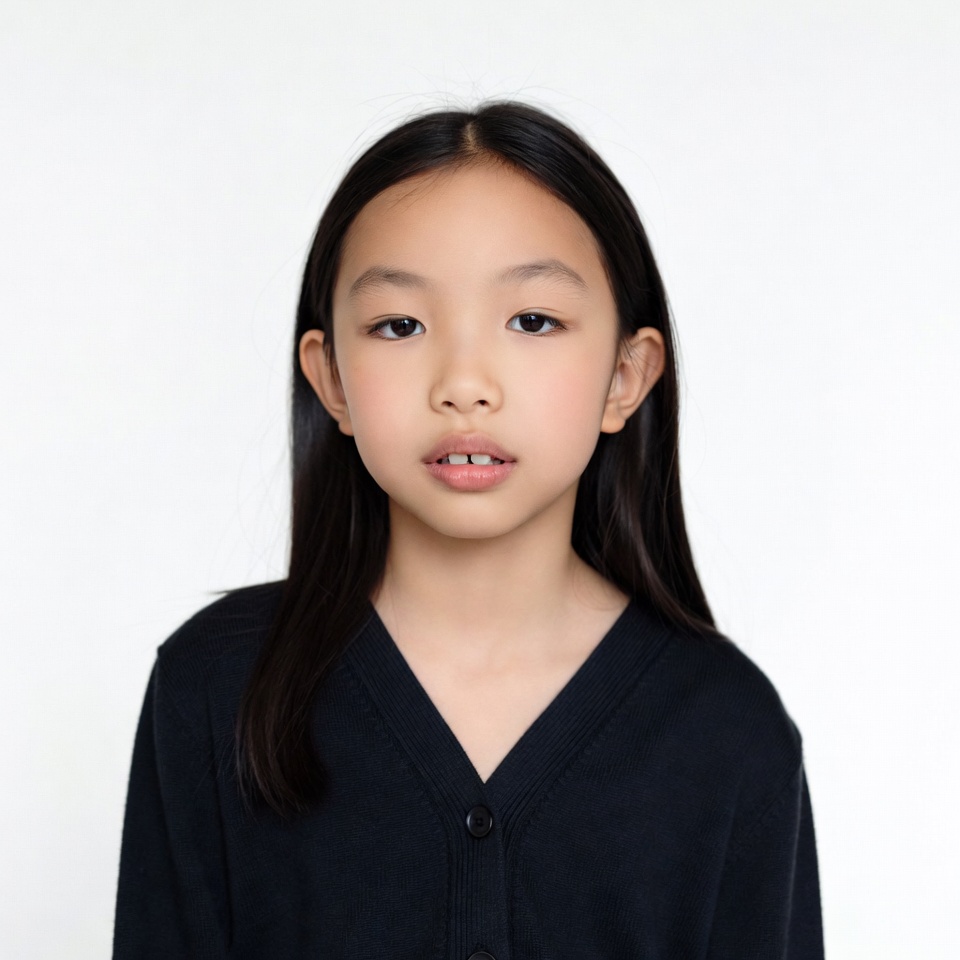 A young Asian girl with straight black hair stands against a white background. She wears a black v-neck cardigan with buttons and has a neutral expression. Her face is centered in the close-up portrait.