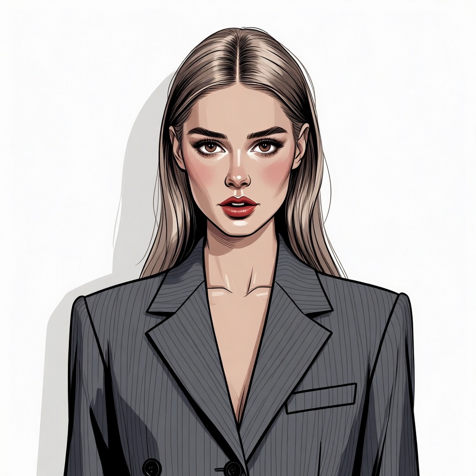 A digital illustration of a young woman with long straight blonde hair and red lips stares forward against a white background. She wears a stylish gray blazer with a deep V-neckline and subtle shadows accentuating her features. The artwork features clean lines and a professional appearance.