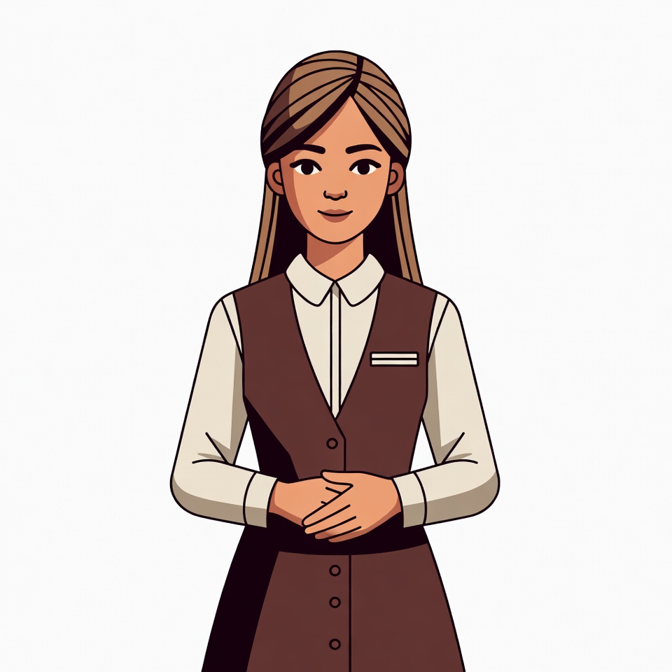 An illustrated Asian woman with long brown hair stands with hands clasped in front. She wears a white collared shirt under a brown vest and skirt uniform with a white stripe on the vest. The image features a clean white isolated background.