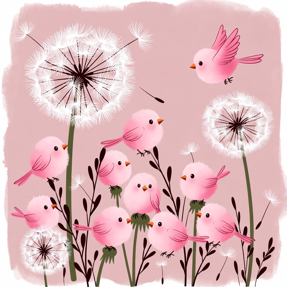 A whimsical illustration features multiple cute pink birds perched on green stems among fluffy white dandelion seed heads. The birds have big eyes and are flying or sitting playfully. The scene is set against a soft pink background.