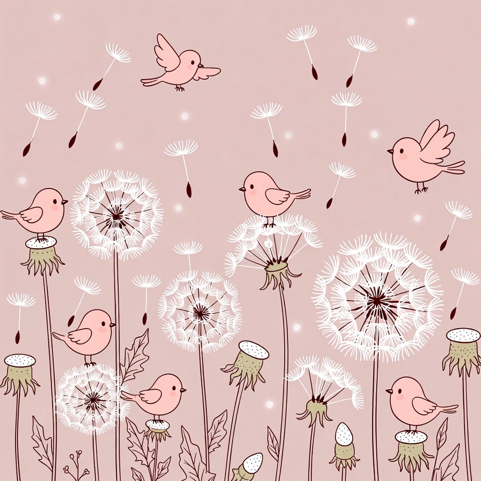 A whimsical illustration features multiple pink birds perched on and flying around fluffy white dandelion seed heads on tall green stems. The elements float against a soft pink background, with dandelion seeds drifting in the air. The artwork uses a cute, cartoonish style with simple line details.