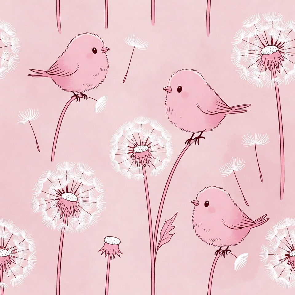 A seamless pattern illustration features cute pink birds perched on white dandelion stems against a soft pink background. The birds have round bodies, small beaks, and tiny feet gripping the fluffy dandelion heads. Multiple repeating motifs of birds and dandelions create a whimsical, tiled design.
