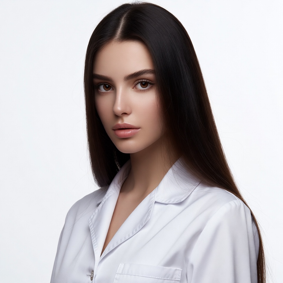 White, almond eyes, beautiful woman, closeup face, collared jacket, doctor coat, female, full lips, headshot, isolated background, lab coat, long black hair, pink lipstick, portrait, professional attire, straight hair, studio photo, white coat, young woman, woman