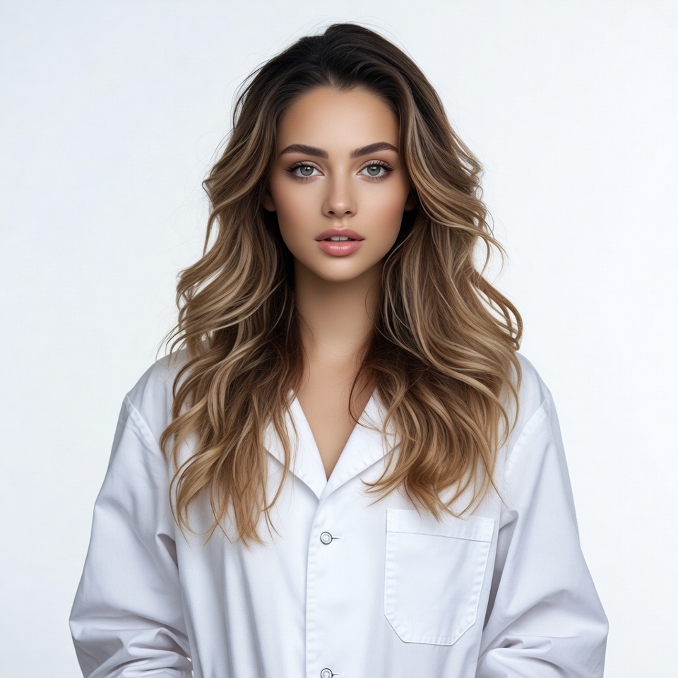 A young woman with long wavy brunette hair stands against a white background wearing an open white lab coat. She has striking green eyes and full lips with a subtle smile. Her hair cascades over her shoulders, framing her face.