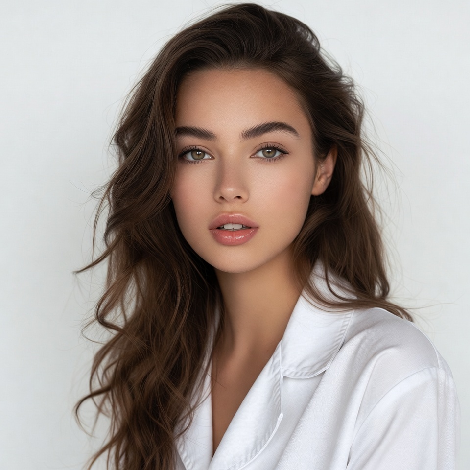 A young woman with long wavy brown hair gazes at the camera against a white background. She has green eyes, subtle makeup, and glossy pink lips. She wears a white collared shirt with the top buttons undone.