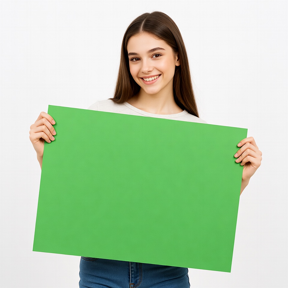 A young woman with long brown hair smiles happily while holding a large green blank sign in front of her. She wears a white t-shirt and blue jeans against a white background. Her eyes are bright and she grips the sign with both hands.