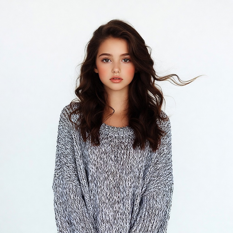A young girl with long wavy brown hair stands against a white background. She wears an oversized gray knit sweater and gazes at the camera with a subtle pout. Her hair flows gently to one side.