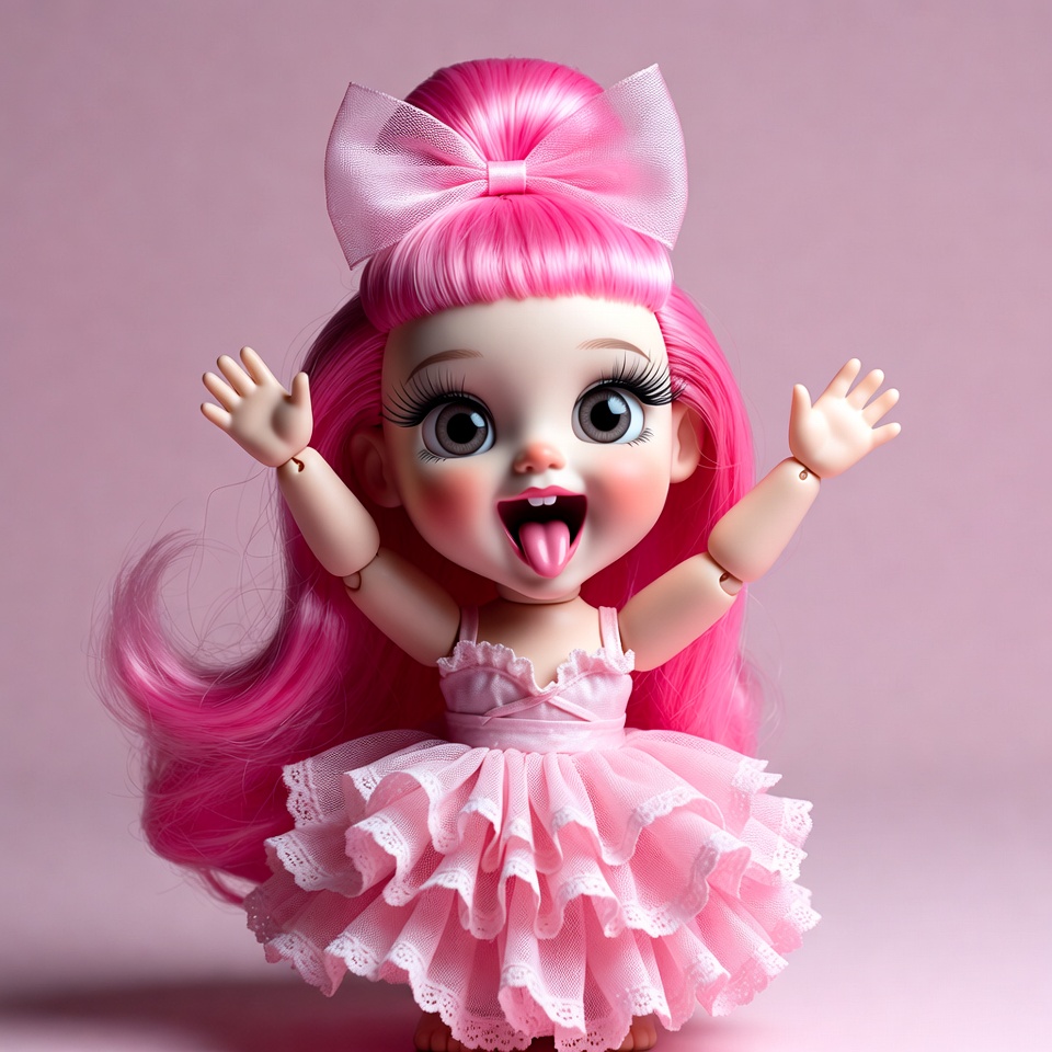BJD, anime doll, arms raised, ball-jointed doll, cute doll, excited pose, frilly dress, girl doll, illustration, isolated background, large eyes, pink background, pink bow, pink dress, pink hair, playful doll, sticking tongue, toy doll, tutu dress, doll