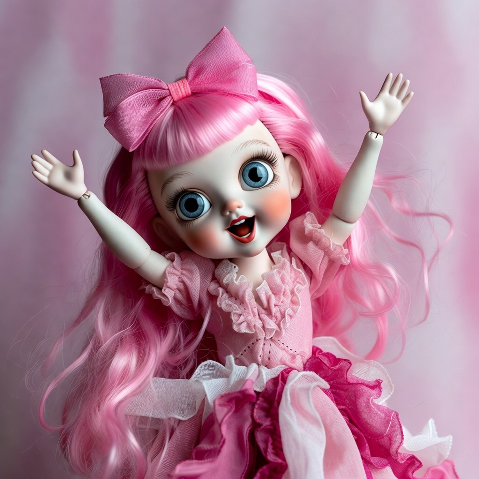 anime doll, ball-jointed doll, big bow, bjd, blue eyes, cute doll, frilly dress, happy doll, illustration, isolated background, joyful pose, large eyes, pink background, pink bow, pink dress, pink hair, raised arms, ruffled dress, smiling doll, toy, doll