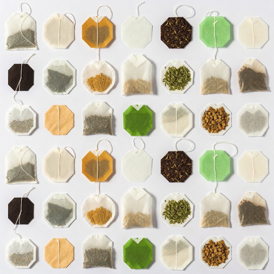 arranged, assortment, beige tag, black tea, flat lay, green tag, green tea, grid, herbal tea, herbs, isolated, leaves, loose tea, mesh pouch, orange tag, powder, product display, strings, tea, teabags, variety, white background, white tag, tea bags