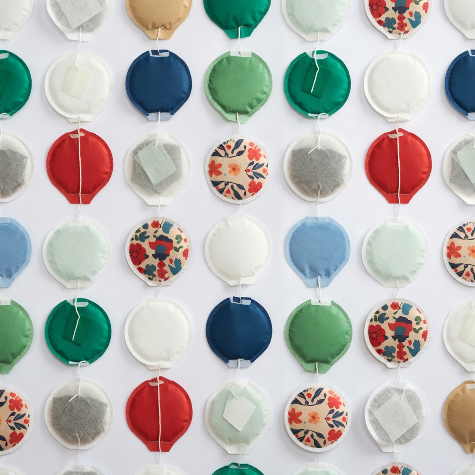 A grid of colorful round tea bags in various hues including green, blue, red, beige, and white hangs against a white background. Each tea bag features a paper tag with intricate floral designs and a string attached. The arrangement displays a symmetrical pattern of vibrant fabric pouches.