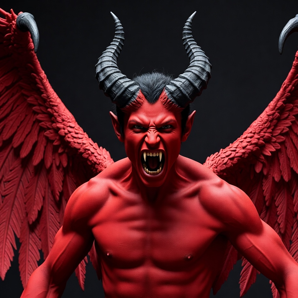 3D render, Satan, bat wings, black background, claws, curved horns, demonic face, devil, digital art, evil, fangs, fantasy creature, fierce, horns, illustration, infernal, muscular, powerful demon, red demon, red skin, roaring, sharp teeth, wings spread, demon