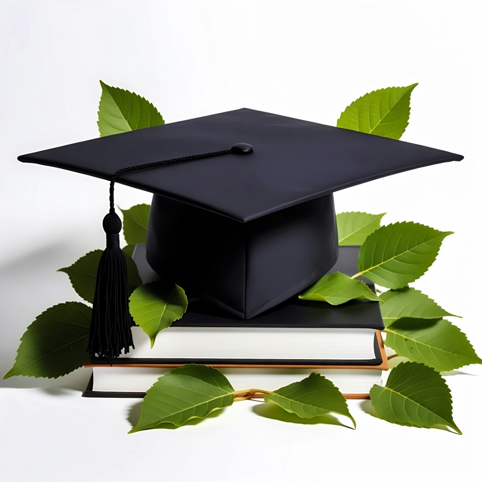 Graduation Cap on Books with Leaves