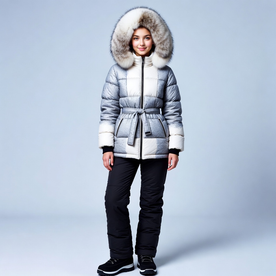 A young Asian woman stands wearing a gray quilted parka jacket with white fur hood and cuffs. She pairs it with black ski pants and black winter boots on a plain light blue background. The jacket features a belted waist and contrasting white panels.