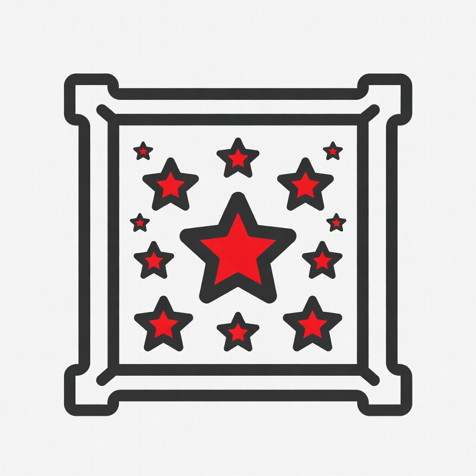 award stars, black frame, bold outlines, central star, clipart, gold stars, isolated background, line art, multiple stars, rating stars, simple icon, square frame, star illustration, vector graphic, red stars
