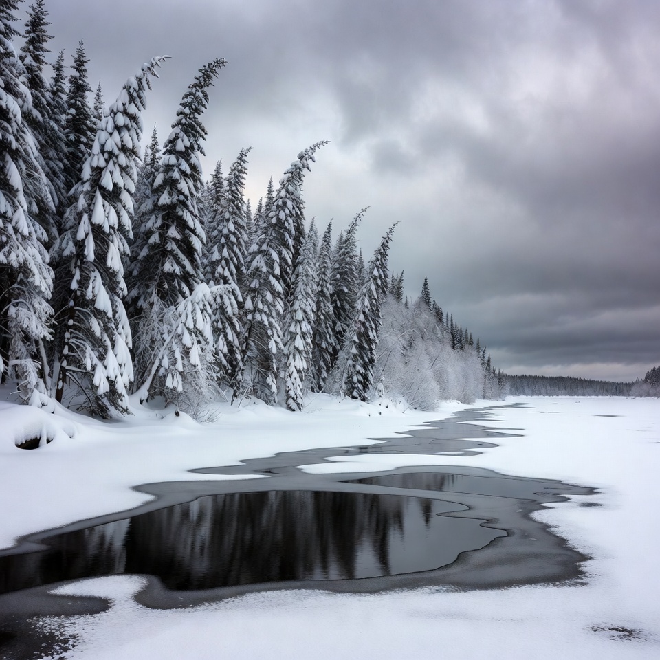 bending trees, cloudy sky, cold weather, dark water, evergreen forest, fir trees, forest edge, frozen stream, frozen water, gray clouds, ice pool, nature scene, pine trees, snow covered trees, snowy ground, white snow, wilderness, winter landscape, wintry trees, snowy forest