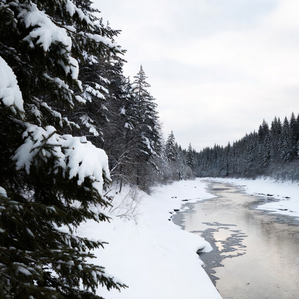 A serene river flows through a dense forest blanketed in heavy snow. Tall evergreen trees line both banks, their branches laden with fresh white snow. The sky is overcast, reflecting softly on the partially icy river surface.