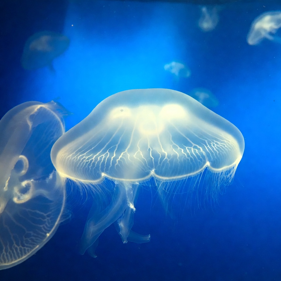 aquarium, aquatic, blue water, cluster, cnidaria, drifting, floating, glowing, group, jelly fish, marine life, medusa, ocean, sea creatures, swimming, tentacles, translucent, transparent, underwater, jellyfish