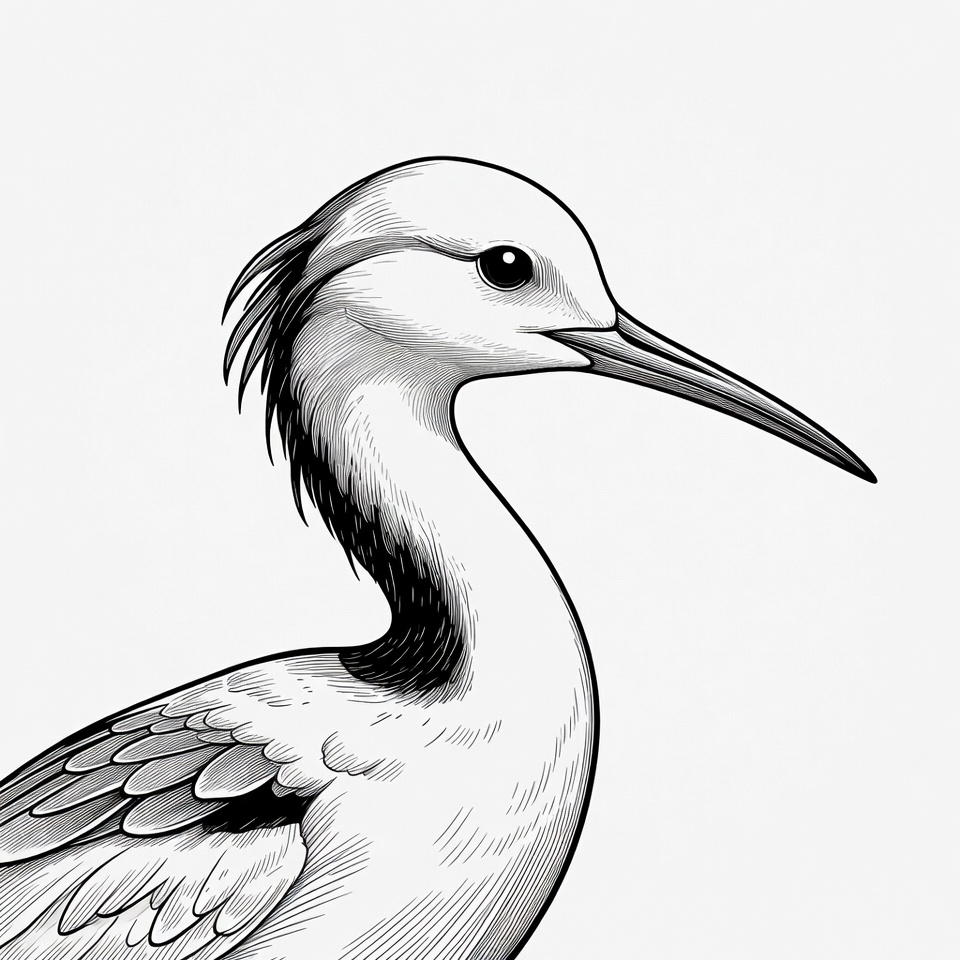animal illustration, avian, bird, black and white, crest, detailed feathers, feathers, heron-like, illustration, ink drawing, isolated background, line drawing, long beak, nature art, profile view, shorebird, vector style, white bird, wildlife, egret