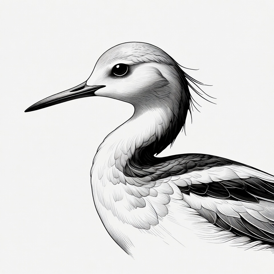 animal, bird, black and white, crest, detailed, drawing, feathers, illustration, isolated background, long bill, pencil sketch, profile view, shorebird, wading bird, wildlife, avocet