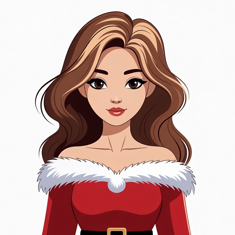 Asian, Christmas, Santa dress, beautiful, black belt, brown hair, cartoon, clipart, female, holiday, illustration, long hair, off-shoulder, portrait, red dress, smiling, wavy hair, white fur, young woman, woman