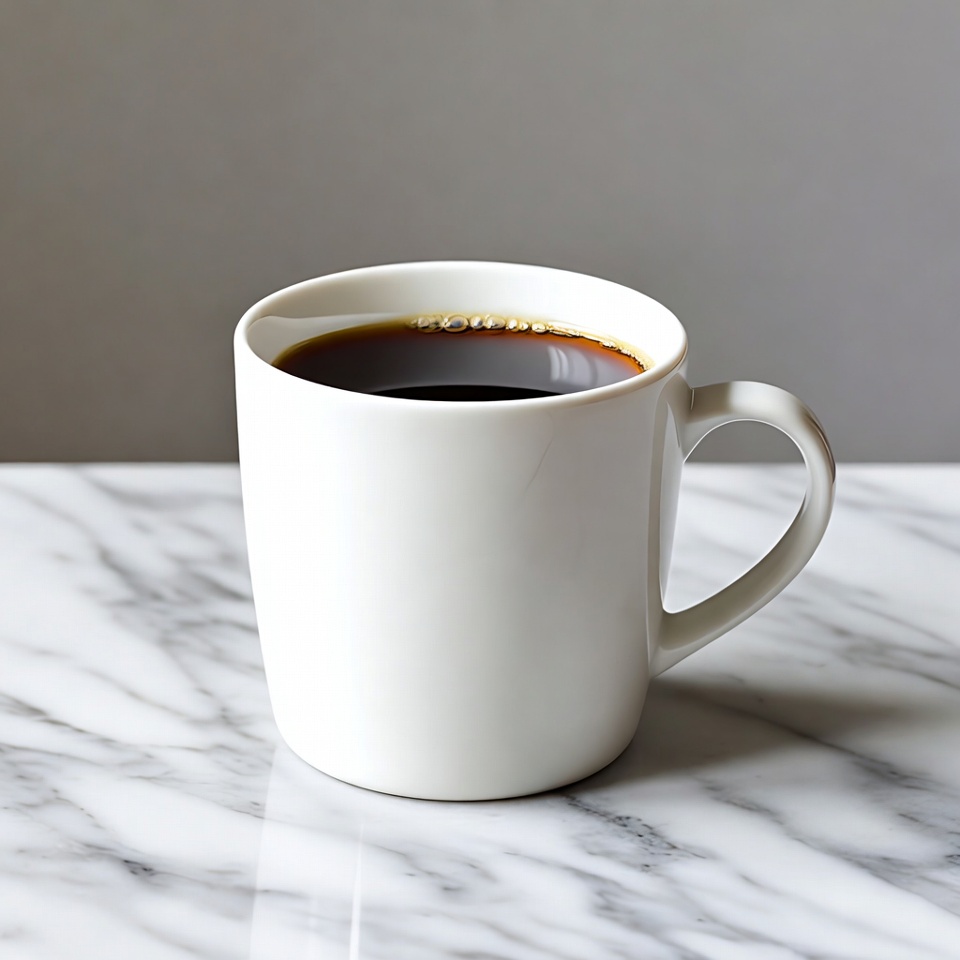 A white ceramic mug filled with steaming black coffee sits on a marble countertop. The coffee's dark surface shows a glossy sheen and subtle steam rising. The mug features a simple handle and is centered against a plain gray background.