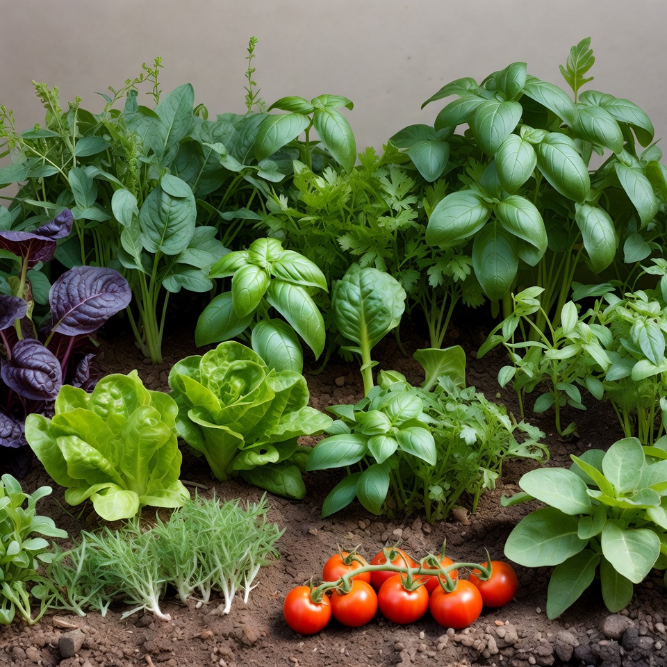 A vibrant herb garden features lush green basil, parsley, lettuce, and purple leafy greens growing in rich brown soil. Clusters of ripe red cherry tomatoes sit prominently in the foreground. Various fresh herbs and vegetables are arranged neatly against a plain beige background.