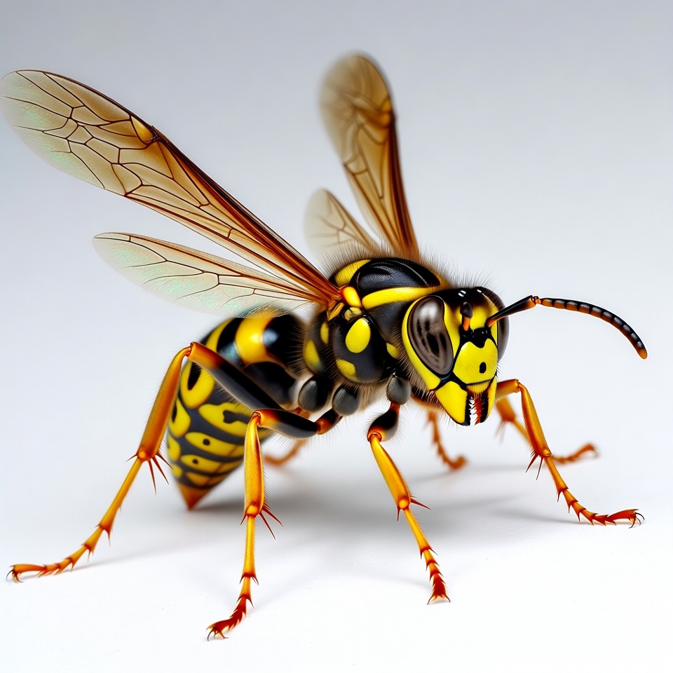 antennae, arthropod, closeup, detailed, flying insect, insect, isolated background, legs, realistic, striped pattern, white background, wings, yellow black stripes, yellow jacket, wasp